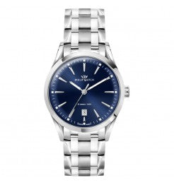 Quadrante analogico blu con indici a bastoni, datario a ore 6 e logo nella parte alta. Vetro minerale a doppia curvatura.