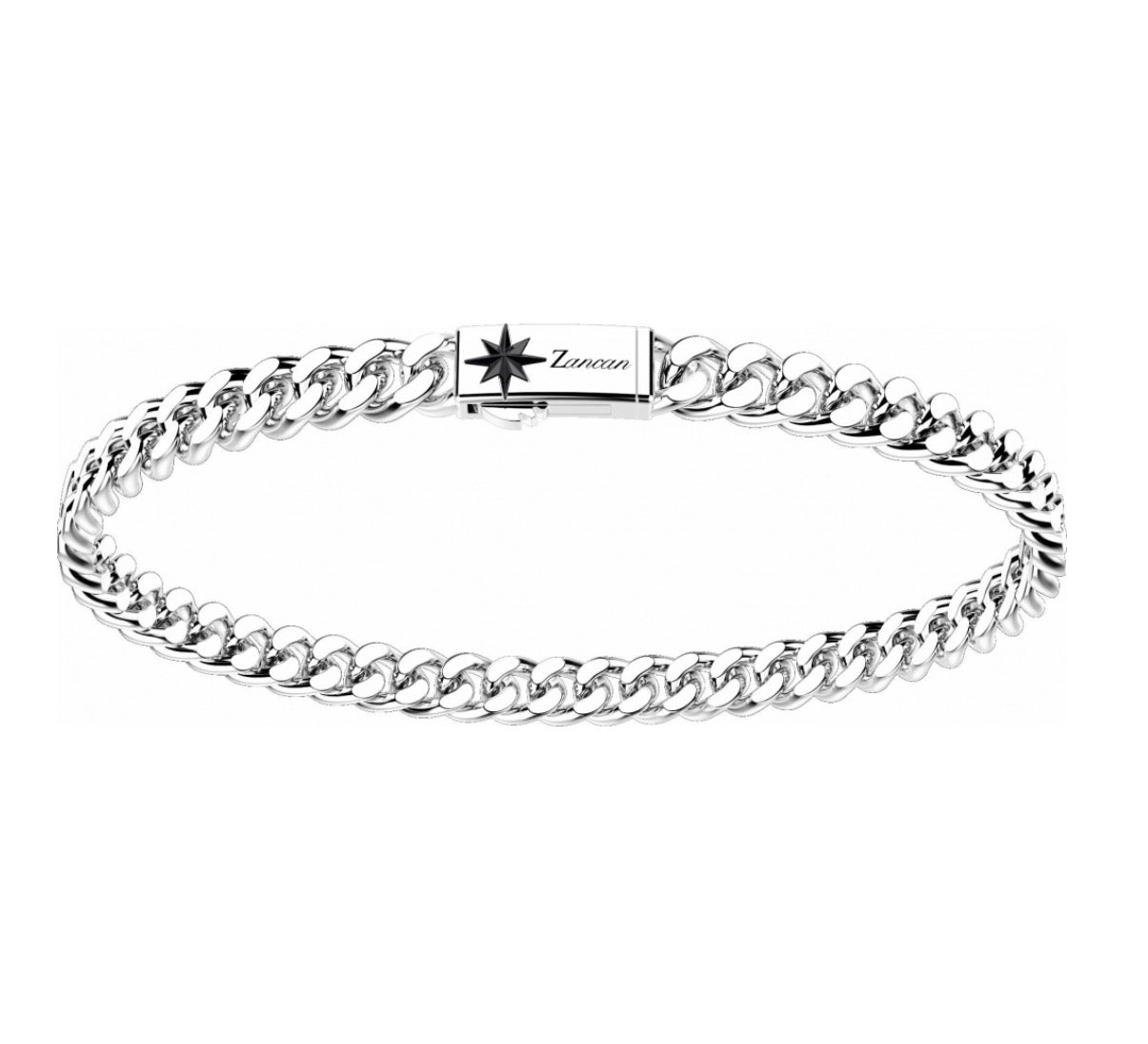 Bracciale a grumetta Zancan in argento 925. La maglia morbida in finitura lucida ha una chiusura a scatto caratterizzata dalla rosa dei venti Zancan. La particolare colorazione è ottenuta da una lavorazione al rodio bianco che ne rende l'aspetto inalterabile. Un gioiello dalla lavorazione Zancan inedita che lo rende unico nel suo genere. Il bracciale fa parte della collezione Cubane, ispirata al mondo Hip-hop ed underground. Il bracciale è interamente realizzato a mano in Italia ed ha un peso di 17.00gr.