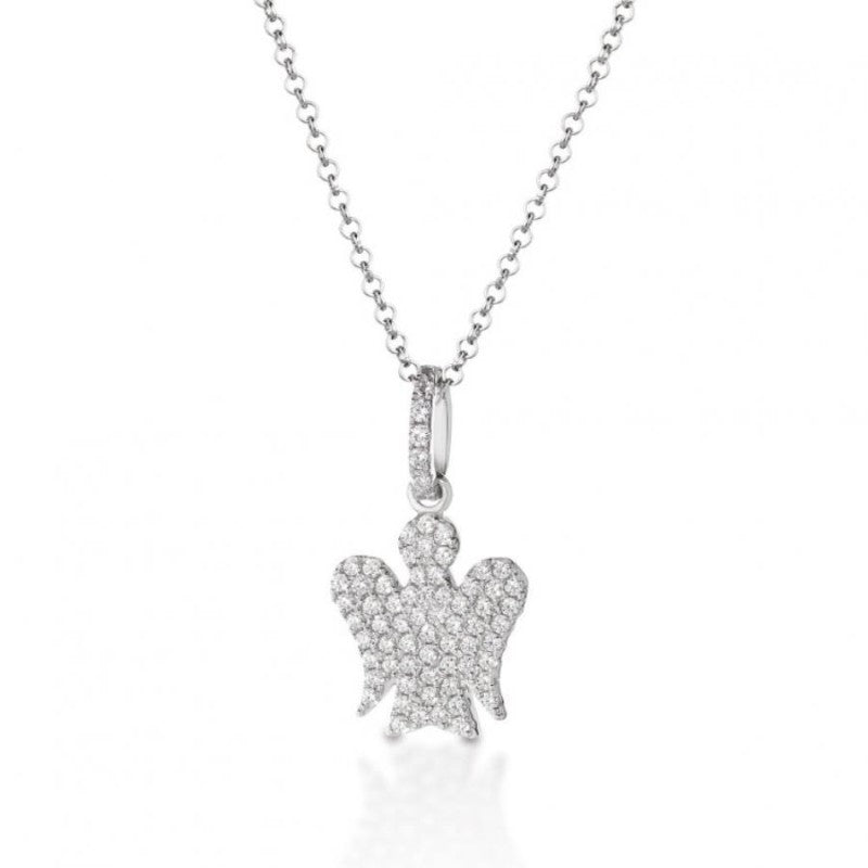 La collana è caratterizzata da un Angelo pendente impreziosito da un luminoso pavé di zirconi bianchi.