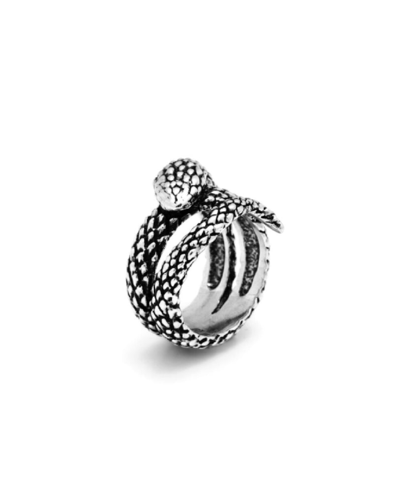 Scaglie lucenti di serpente e texture in argento brunito insieme nell'anello Serpente Grande di Giovanni Raspini. Qui il tema stilistico con rettile arrotolato viene interpretato in termini figurativi, creando un gioiello, fatto a mano, avvolgente ed elegante.
