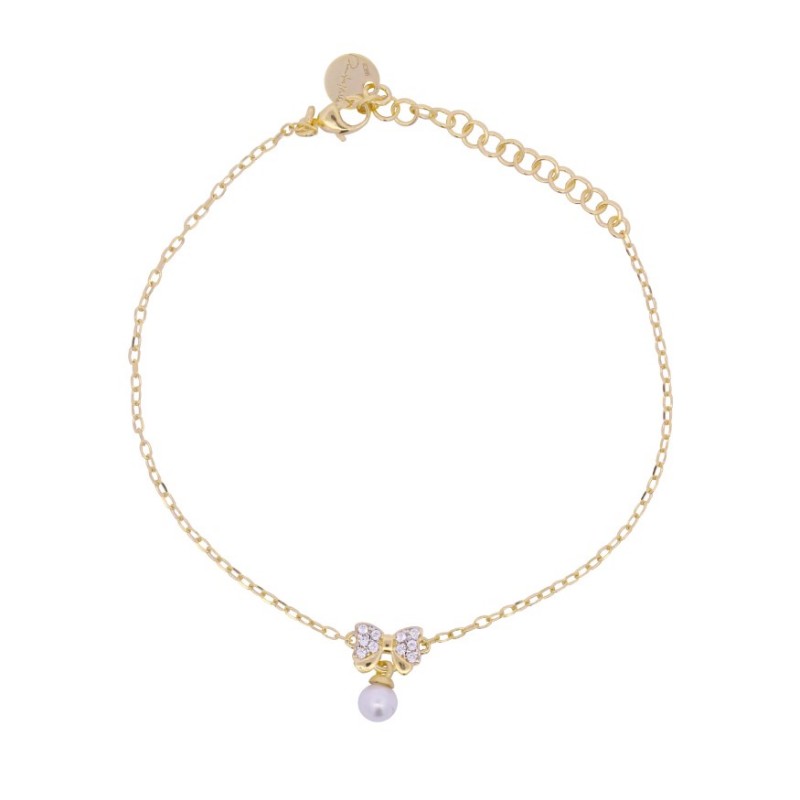 Braccialetto catena e soggetto centrale fiocco e zirconi bianchi e shell pearl pendente.