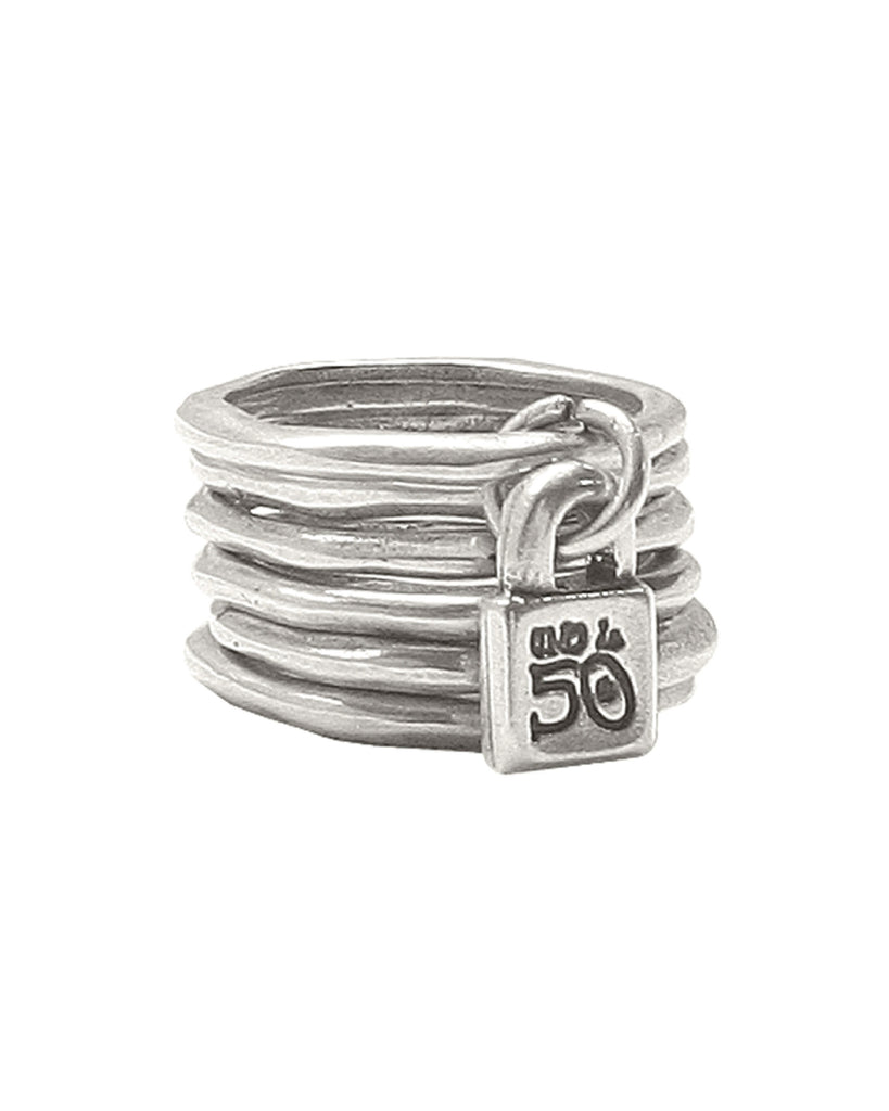 Anello della collezione UNO de 50 Prisonero da donna. Colore: argento. L’anello è in lega metallica rivestita in argento 15 micron composto da 6 anelli sottili che uniti formano un fascione, è presente il lucchetto, simbolo del marchio.